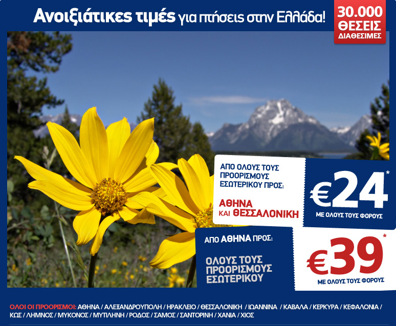Η προσφορά αφορά σε απευθείας πτήσεις εσωτερικού από/προς Αθήνα & Θεσσαλονίκη, ισχύει για κρατήσεις έως 30/01/10 και για πτήσεις από 16/02/10 – 15/05/10. Εξαιρείται το διάστημα 24/03/10 – 13/04/10. Για τις πτήσεις από όλους τους προορισμούς εσωτερικού προς Αθήνα & Θεσσαλονίκη ο ναύλος της προσφοράς είναι €24*, ενώ για τις πτήσεις από Αθήνα προς όλους τους προορισμούς εσωτερικού ο ναύλος της προσφοράς είναι €39*. Ο ναύλος της προσφοράς για το δρομολόγιο Αθήνα – Θεσσαλονίκη είναι €39*. *Οι ναύλοι ισχύουν για απλή μετάβαση, περιλαμβάνουν όλους τους φόρους και τη χρέωση συναλλαγής 4€ ανά επιβάτη για αγορά εισιτηρίου από το site της Aegean. Δεν επιτρέπονται αλλαγές στο εισιτήριο, ενώ σε περίπτωση ακύρωσης δεν επιστρέφεται η αξία του ναύλου. Η προσφορά αφορά στις απευθείας πτήσεις από Θεσσαλονίκη προς στους προορισμούς: Αθήνα, Ηράκλειο, Χανιά, Μυτιλήνη & Ρόδο.