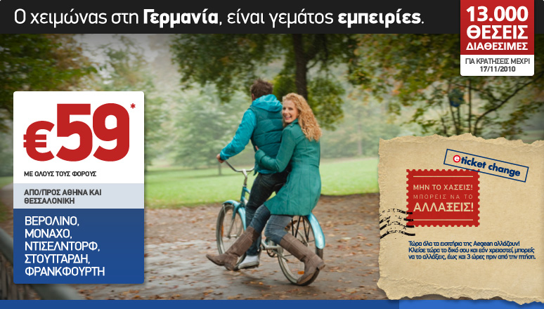 Η προσφορά αφορά σε απευθείας πτήσεις της Aegean από/προς Αθήνα και Θεσσαλονίκη για Βερολίνο, Μόναχο, Ντίσελντορφ, Στουτγάρδη και Φρανκφούρτη. Ισχύει για κρατήσεις έως 17/11/2010 και για πτήσεις από 01/12/2010 έως 22/03/2011, εξαιρείται το διάστημα 17/12/2010 - 09/01/2011 & 04/03/2011 - 08/03/2011. *Ο ναύλος ισχύει για απλή μετάβαση, περιλαμβάνει όλους τους φόρους και τις αντίστοιχες χρεώσεις συναλλαγής ανά επιβάτη για αγορά εισιτηρίου από το site της Aegean. Επιτρέπονται αλλαγές στο εισιτήριο, και σε περίπτωση ακύρωσης δεν επιστρέφεται η αξία του ναύλου. Οι πτήσεις Αθήνα - Στουτγάρδη πραγματοποιούνται μέσω Θεσσαλονίκης. |