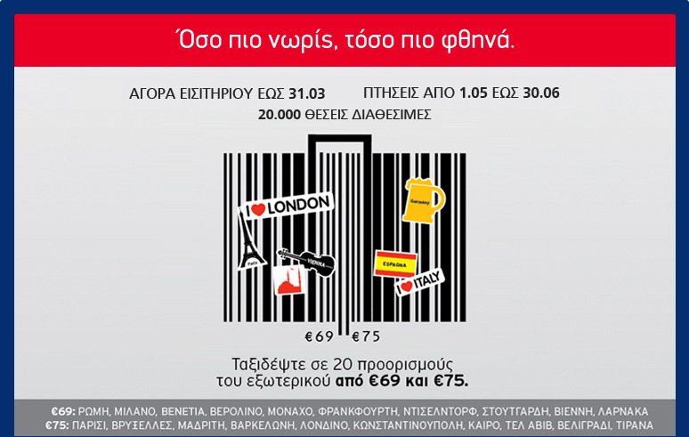 Η προσφορά αφορά σε απευθείας πτήσεις από/προς Αθήνα και Θεσσαλονίκη για Βαρκελώνη, Βενετία, Βελιγράδι, Βερολίνο, Βιέννη, Βρυξέλλες, Κάιρο, Κωνσταντινούπολη, Λάρνακα, Λονδίνο, Μαδρίτη, Μιλάνο, Μόναχο, Ντίσελντορφ, Παρίσι, Ρώμη, Στουτγάρδη,Τελ Αβίβ, Τίρανα, Φρανκφούρτη. Ισχύει για κρατήσεις έως 31/03/2010 και για πτήσεις από 01/05/2010 έως 30/06/2010 *Οι ναύλοι ισχύουν για απλή μετάβαση, περιλαμβάνουν όλους τους φόρους και τις αντίστοιχες χρεώσεις συναλλαγής ανά επιβάτη για αγορά εισιτηρίου από το site της Aegean. Δεν επιτρέπονται αλλαγές στο εισιτήριο, ενώ σε περίπτωση ακύρωσης δεν επιστρέφεται η αξία του ναύλου. Οι πτήσεις Αθήνα - Στουτγάρδη πραγματοποιούνται μέσω Θεσσαλονίκης. Ο ναύλος από Λονδίνο είναι £75. *Οι απευθείας πτήσεις από Θεσσαλονίκη είναι προς Λάρνακα, Φρανκφούρτη, Μόναχο, Στουτγάρδη και Ντίσελντορφ. |