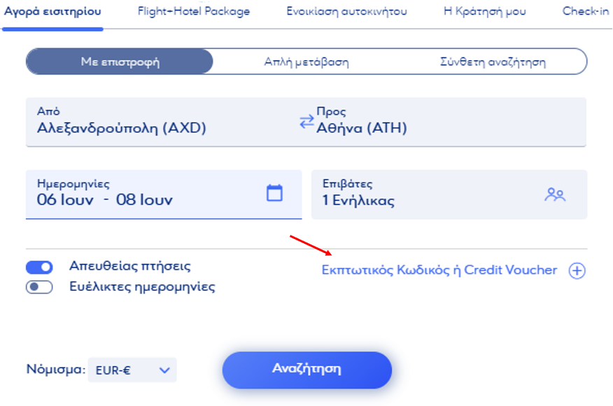 - Η έκπτωση στο ναύλο θα φανεί αφού επιλεγεί και η πτήση της επιστροφής σας. Υπενθυμίζεται ότι η έκπτωση δεν εφαρμόζεται σε φόρους και τέλη.