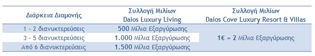 Για διαμονές και στα δύο Daios Hotels έως και τις 31.07.2013 τα Μέλη κερδίζουν μίλια σύμφωνα με την αναλογία 1€ = 2 Μίλια Εξαργύρωσης.