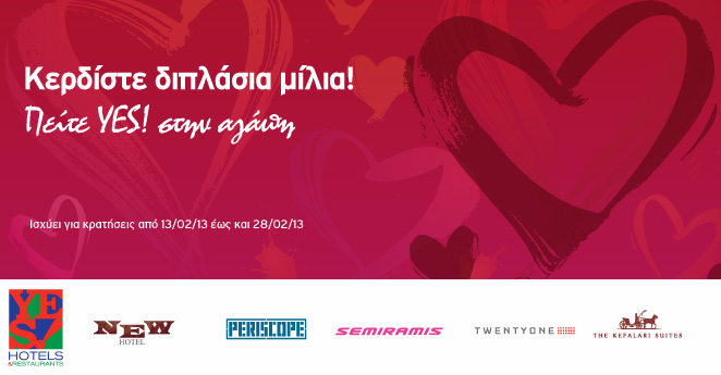 Η γιορτή του Αγίου Βαλεντίνου είναι εδώ και εσείς κερδίζετε διπλά στην αγάπη με κάθε διαμονή σας στα YES!Hotels. Κάντε κράτηση από τις 13/02/13 έως και τις 28/02/13 για όλη τη διάρκεια του 2013 και κερδίστε διπλάσια μίλια στο Miles&Bonus λογαριασμό σας!